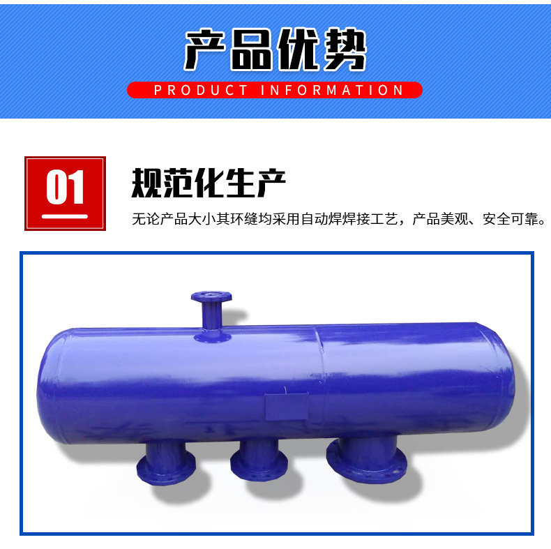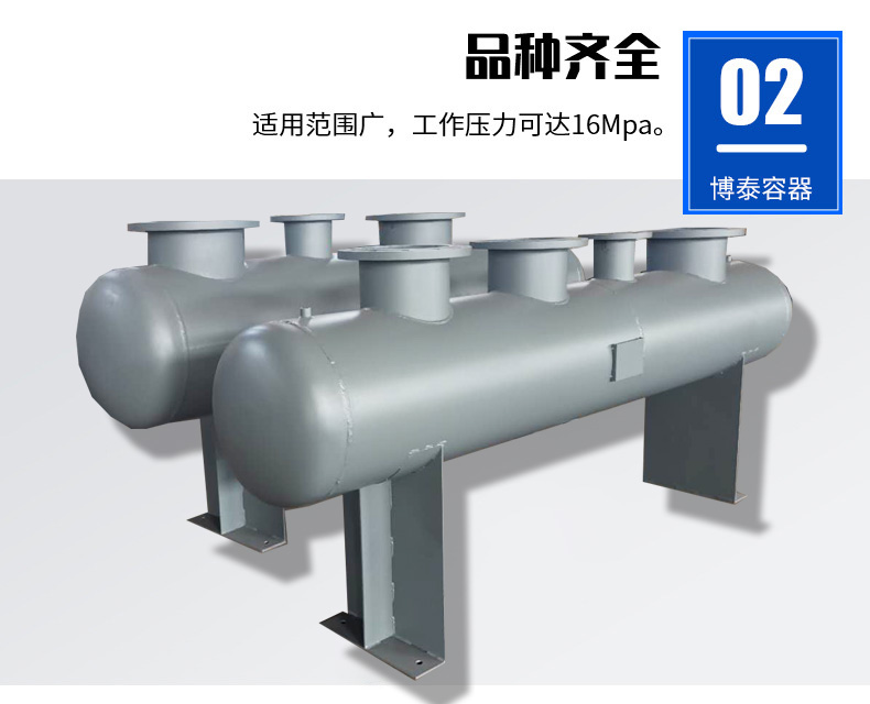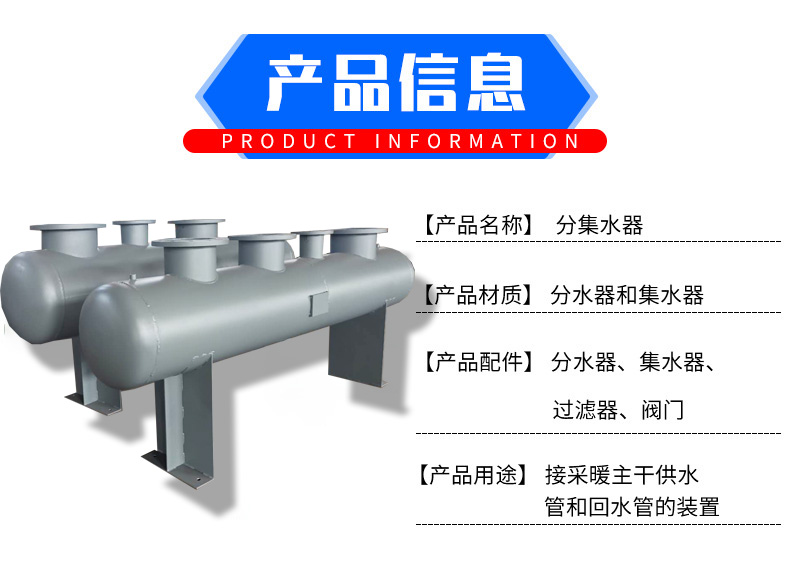 集分水器又名分集水器是由集水器和分水器组合而成的水流量分配和会集装置。分水器是将一路进水分散为几路输出的设备,而集水器是将多路进水汇集起来在一路输出的设备。结构由主管、分路支管、排污口、排气口、压力表、温度计等组成直径较大的筒体上装有人孔或手孔,材质由碳钢板卷制,或无缝钢管制作而成,能承受一定压力,属于压力容器类专业制造,外表面做防腐或保温处理。